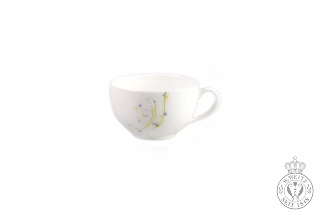 Wie ein Hauch von Feenstaub, den kleine Weihnachtselfen auf dem zarten Fine Bone China Porzellan hinterlassen haben, wirkt das Dekor des Dibbern Weihnachtsgeschirrs Christmas. Ein Engel, der mit einer Trompete Sterne in den Porzellanhimmel musiziert, Rentiere und Santa Claus – alle umgeben von Sternchenmotiven – zieren in gold und blau das grazile Knochenporzellan. Mit dem Christmas Weihnachtsgeschirr ist Dibbern ein verträumtes Dekor gelungen, das kein Stück kitschig ist, sondern sowohl bei Designfans als auch in traditionellen Haushalten wunderschön weihnachtliche Akzente setzt. Als besonderer Clou, ist das gold-blaue Sterne-Dessin bei der Tee-Obertasse innerhalb der Tasse platziert. Für die Weihnachtszeit benötigen Sie entweder morgens viel Energie oder nach dem köstlichen Festmahl einen krönenden Abschluss – beides erhalten Sie bei einem Schluck aus der Dibbern Fine Bone China Espressotasse der Christmas Reihe. Verspielte Sterne zieren die runde Porzellantasse und bringen so die nötige Adventsstimmung auf. Die Espresso-Obertasse des Dibbern Porzellans fühlt sich am wohlsten mit dieser Untertasse.