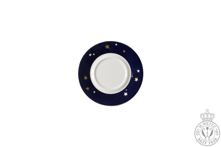 Ein Porzellan der besonderen Art ist das Geschirr Weihnachten. Das festliche Dibbern Fine Bone China Porzellan zeichnet sich durch einen tiefen und eleganten Blauton aus und ist mit weihnachtlichen Motiven wie Santa Claus, Rentieren und Engeln dekoriert. Zarte Sterne aus 24 Karat Goldveredelung zieren zusätzlich den weihnachtlich-blauen „Himmel“ und verleihen ihm einen edlen Schimmer. Trotz seiner außergewöhnlichen blauen Färbung ist das Dibbern Weihnachten Porzellan kratz- und spülmaschinenfest – allerdings ist es nicht für die Mikrowelle geeignet. Das Weihnachtsgeschirr basiert auf der Fine Bone China Form „Pure“ und besitzt somit keine Fahne als Tellerrand.Die zylindrisch flache Espresso-Untertasse aus der dekorierten Dibbern Fine Bone China Serie Weihnachten ist am Rand in einem tiefen Blau verziert und darüber mit goldenen sowie weißen Sternen versehen. Der Spiegel der Untertasse ist in weiß gehalten.Die Dibbern Espresso-Untertasse passt zu der zylindrischen Obertasse der Weihnachtskollektion, aber auch zur der schlicht weißen Espresso-Obertasse aus der Fine Bone China Serie konisch zylindrisch.