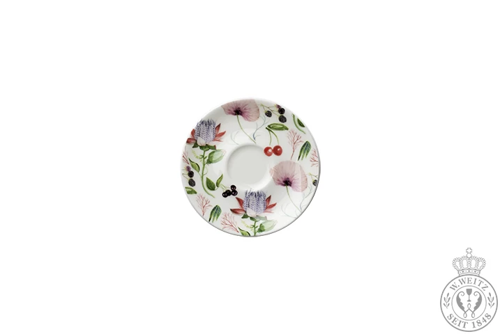 Die runde Dibbern Wunderland Espresso-Untertasse ist wie der volldekorierten Frühstücks-, Speise- oder Platzteller mit einem prächtigen Blumen- und Früchtemeer versehen. Tauchen Sie ab in ein wahres Flower-Wonderland. Der Unterteller ist flach und ohne Fahne (abgesetzten Rand).