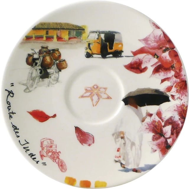 Leuchtende Farben, der Zauber Indiens und eine vielfältige Kulturwelt entführen den Betrachter auf die Route des Indes (Gewürzroute). Das Gien Keramikservice wurde von dem Maler Arnaud d’Aunay entworfen und zeugt von seinen vielfältigen Eindrücken, die er auf seinen zahllosen Reisen gesammelt hat. Freuen Sie sich auf ein Stück „Reiseliteratur“ auf Ihrem Esstisch. Die passende Untertasse zur Espressotasse aus der Gien Route des Indes Kollektion. Die Untertasse fühlt sich am wohlsten mit der dazugehörigen Espressotasse.