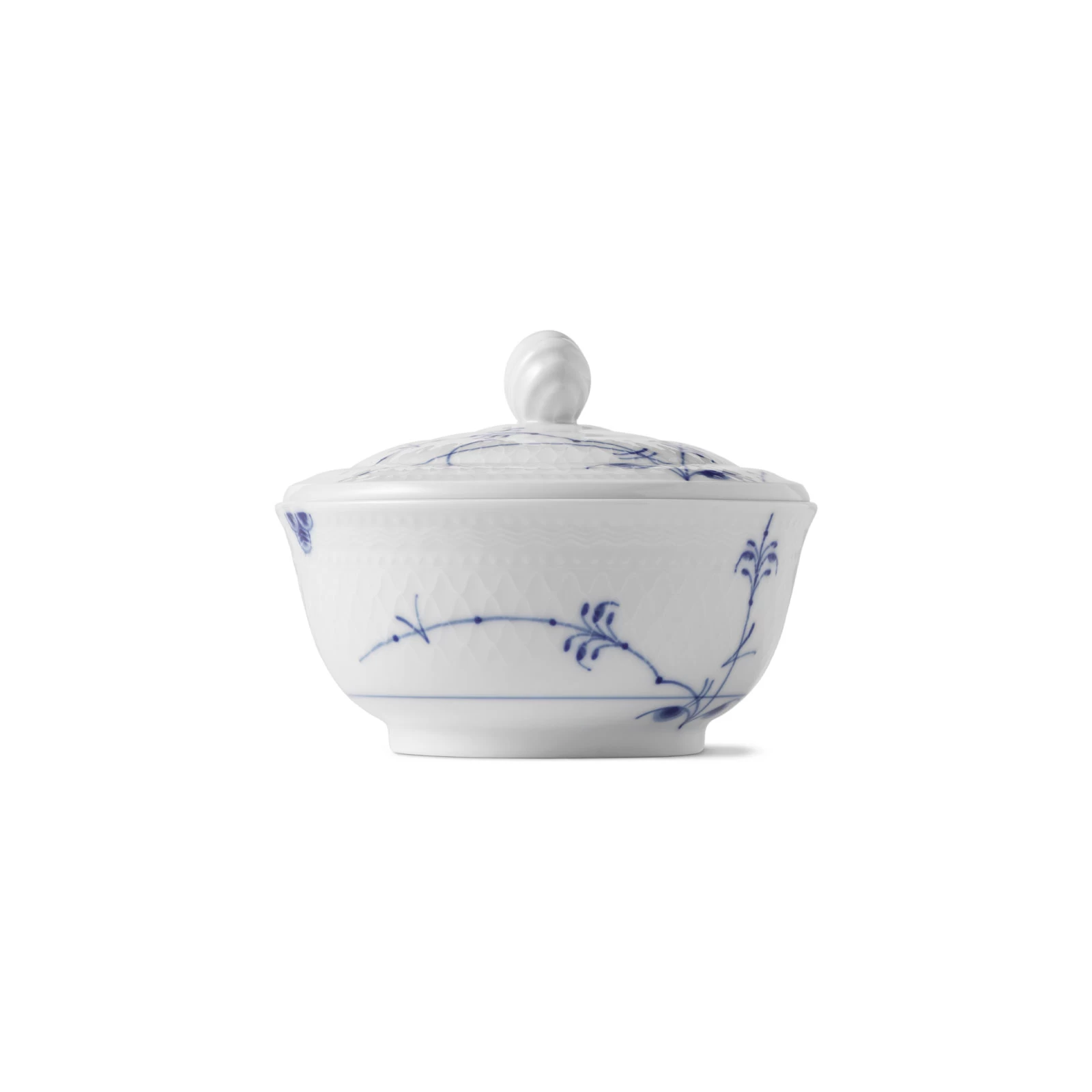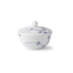 Sie befriedigt Naschkatze und Stilikone zugleich: Die 12cm Zuckerdose mit Deckel aus der Geschirrserie Blue Palmette von Royal Copenhagen. Diese hübsche bemalte Schüssel wird ergänzt durch einen ebenfalls bemalten Deckel mit muschelförmigem Griff. So sieht sie als Zuckerdose toll aus, kann aber auch als abgedeckte Suppenschale verwendet werden. Hier sieht man deutlich die asiatische Inspiration für diese Serie!