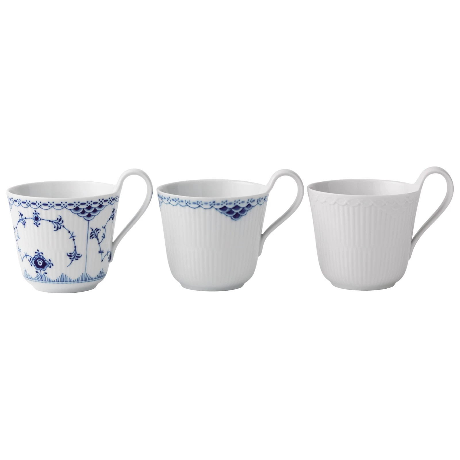 Gleich drei gute Dinge auf einmal: der Royal Copenhagen History Mix, bestehend aus drei verschiedenen Henkelbechern mit 0,33 Liter Fassungsvermögen und dem extra hohen Henkel. Die wunderbare Mischung beinhaltet jeweils einen Becher der Serie Musselmalet Halbspitze/Blue Fluted Half Lace, Prinzess und Weiße Halbspitze / White Fluted Half Lace.