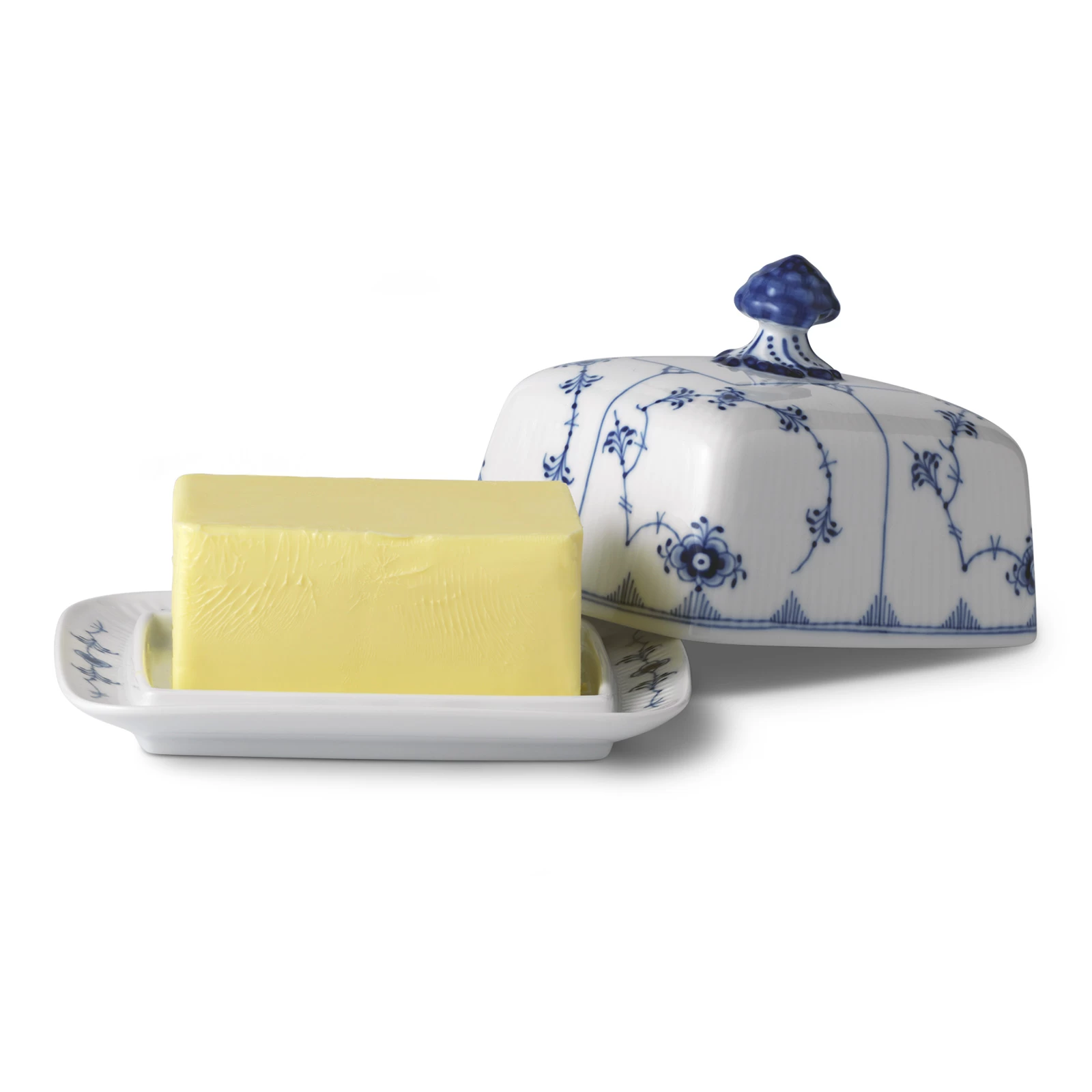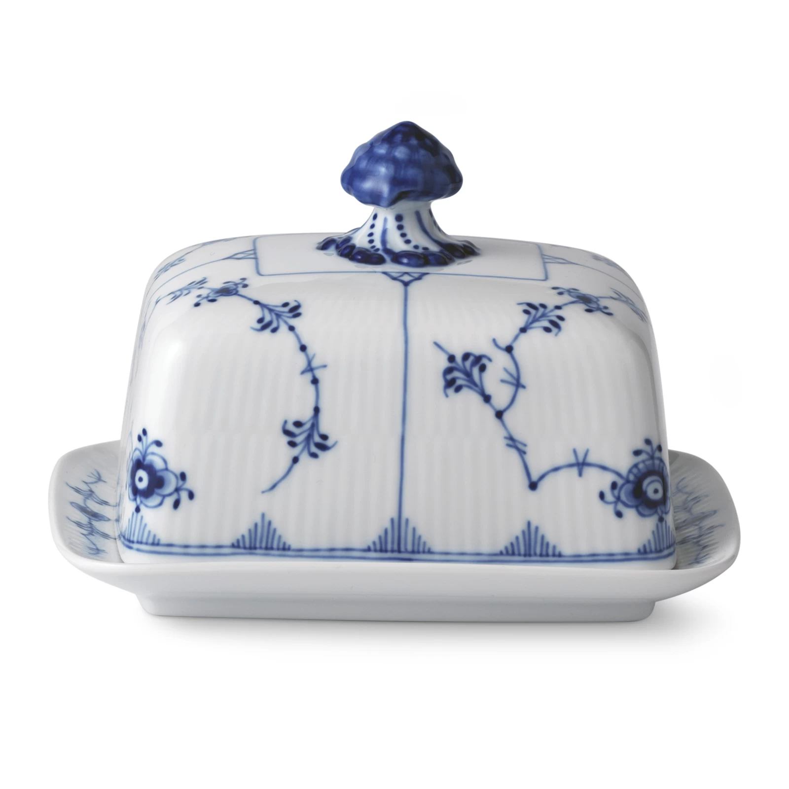 Lassen Sie sich nicht die Butter vom Brot nehmen – die Royal Copenhagen Musselmalet Gerippt Butterdose ist perfekt auf die Serie abgestimmtes und besitzt am Deckel eine wunderschöne blaue Muschelspitze.