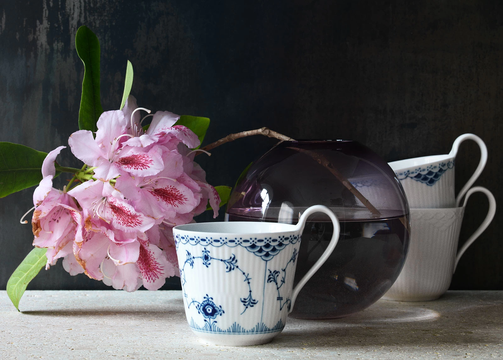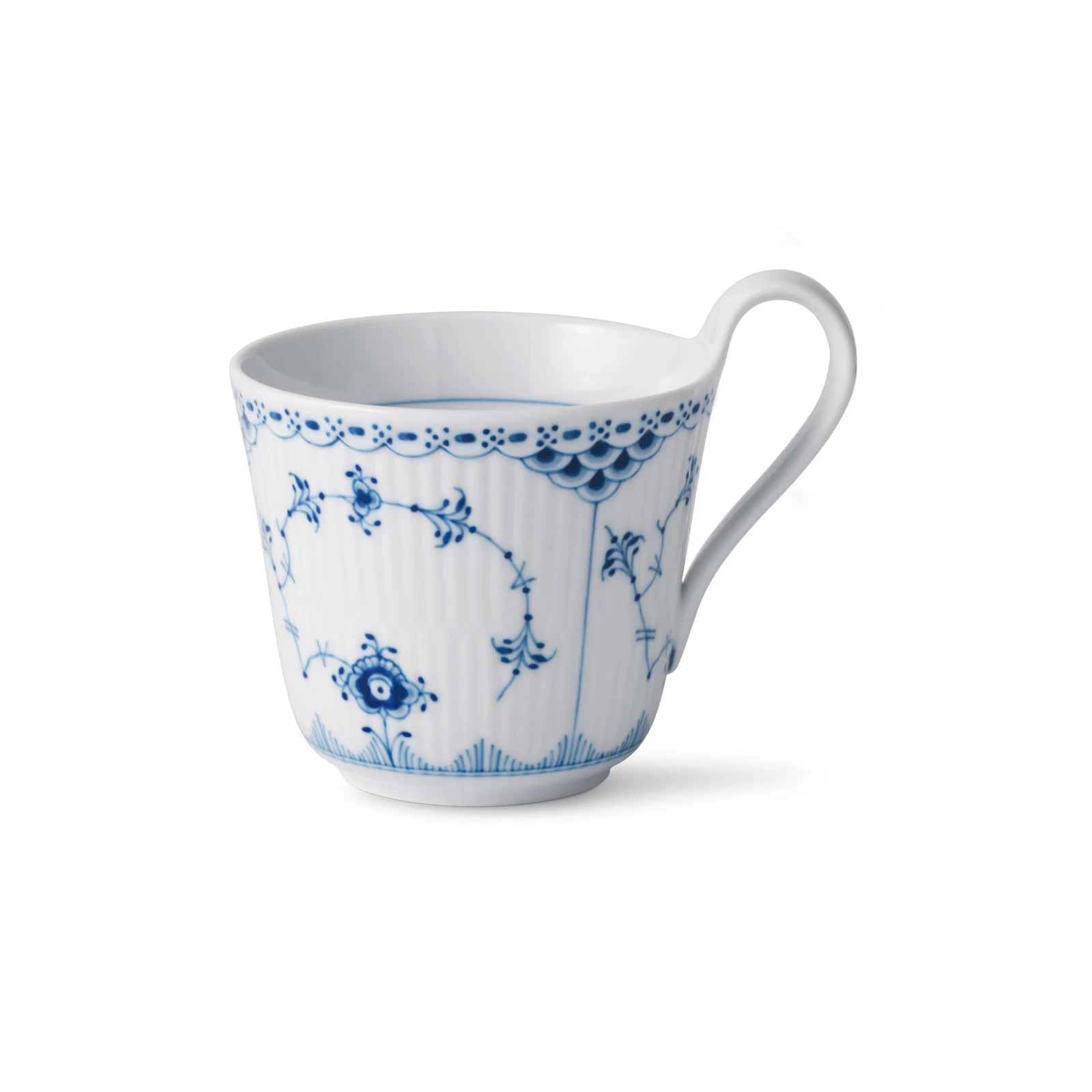 Für den morgendlichen Kaffee oder nachmittäglichen Tee: Der Musselmalet Halbspitze Becher mit dem hohen Henkel von Royal Copenhagen. Dekoriert mit der edlen blauen Handmalerei fällt er auf, bleibt aber trotzdem elegant.